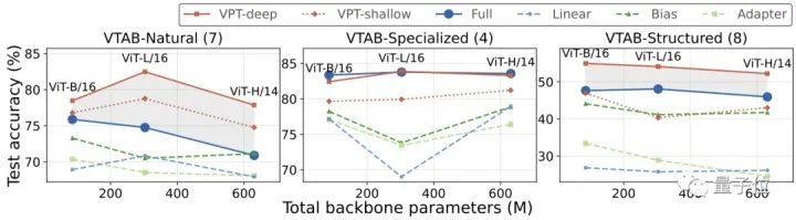 此外,选择不同主干参数规模和模型规模的ViT(ViT-B、ViT-L和ViT-H)进行测试还发现,VPT方法不会受影响,依然基本保持性能领先。