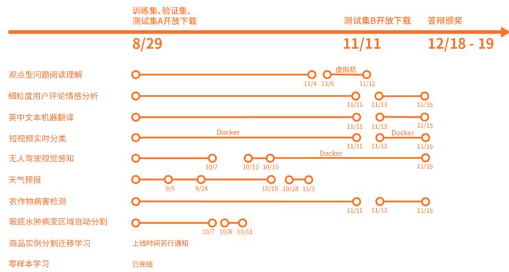其中,5 个主赛道的数据集包括:观点型问题阅读理解数据集、细粒度用户评论情感分析数据集、英中文本机器翻译、多标签短视频分类数据集、以及自动驾驶数据集。