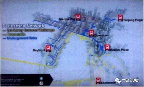 在新加坡商务区,步行至少有城市道路人行道、一层骑楼步行、二层天桥步行、地下隧道步行四套步行系统中的两套,公众步行有多种选择方式。在新加坡滨海湾地区,则同时规划建设有这四套系统。