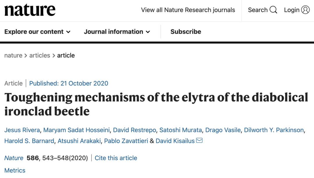 相关工作以“Toughening mechanisms of the elytra of the diabolical ironclad beetle”为题,于 10 月 21 日在顶级科学期刊《自然》(Nature)上在线发表。