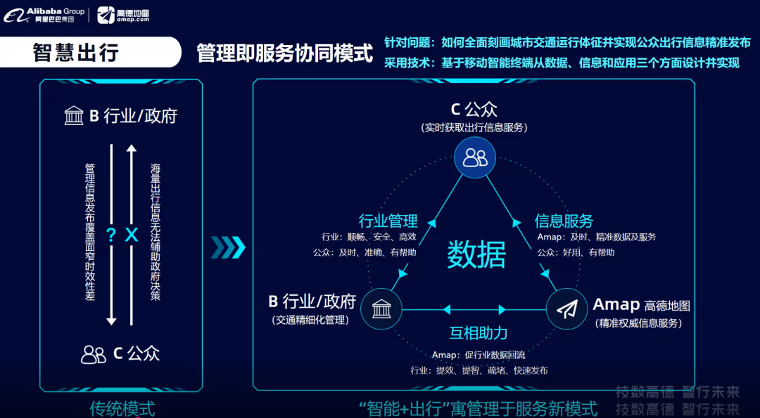 正式分享开始后,苏岳龙首先从信息,协同,创新三个方面,介绍了高德地图在过去几年在城市交通大脑和智慧出行领域做的工作。