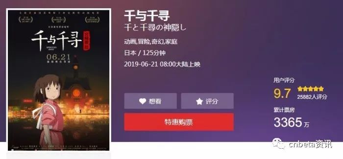 宫崎骏经典动画电影《千与千寻》今天在国内正式上映,收获了相当多的好评,猫眼观众评分9.7分,淘票票9.5分。豆瓣电影和时光网由于收录的是2001年的词条,因此历史评分人数较多,不过今日更新的评分几乎也都是满分。观众们表示在电影院这部经典作品又是另一番心境,时隔这么多年依然感动。