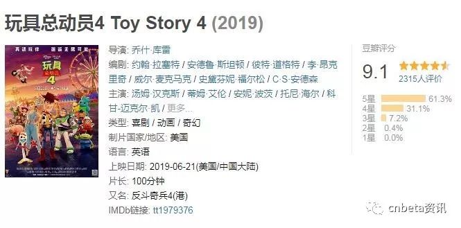 国内方面观众口碑也是相当给力,目前豆瓣评分9.1分,已经看过电影的观众表示,本来害怕皮克斯“狗尾续貂”,打破《玩具总动员》前三部留给大家的完美结局,没想到第四部玩出了新意,是一部既搞笑、又热血的新作,让大家重拾童年的感动。