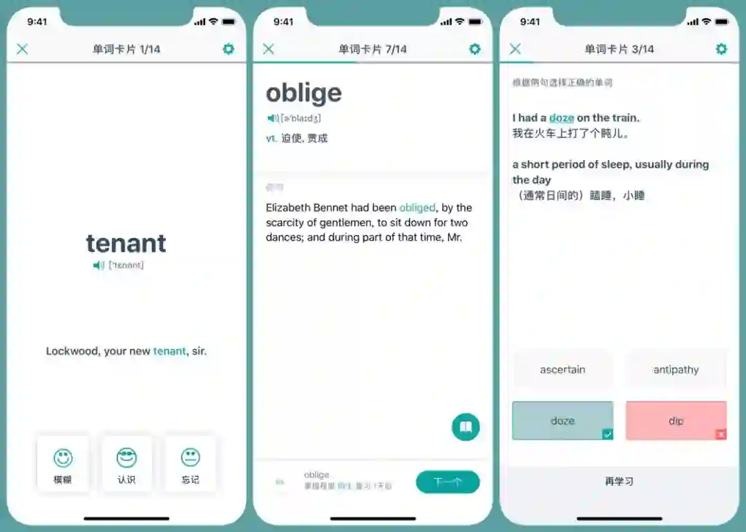 背完生词,你可以用蒙哥阅读器的单词卡片辅助记忆。由于生词均来自读过的书本,你可以在下方直接看到其在原文句子中的用法,印象更加深刻。