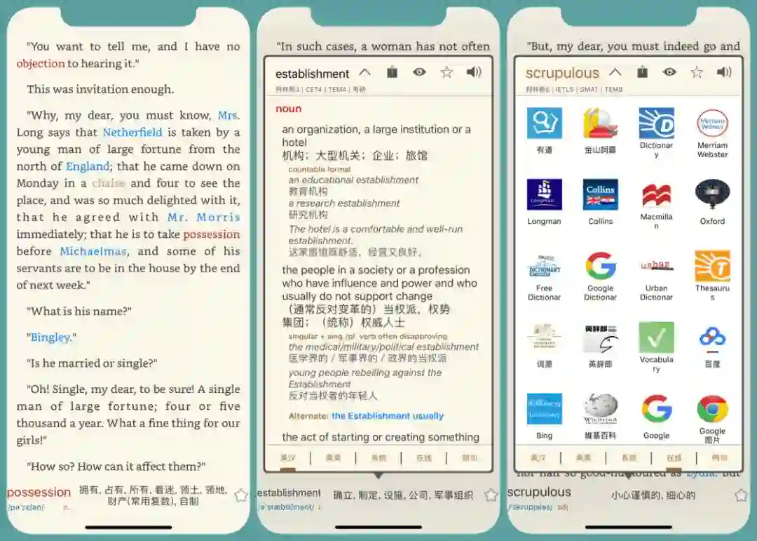 除了本地词典外,蒙哥阅读器还支持牛津、柯林斯、Google、有道等在线词典查询。你也可以将常用词典源固定至快捷栏中,以便随时取用。