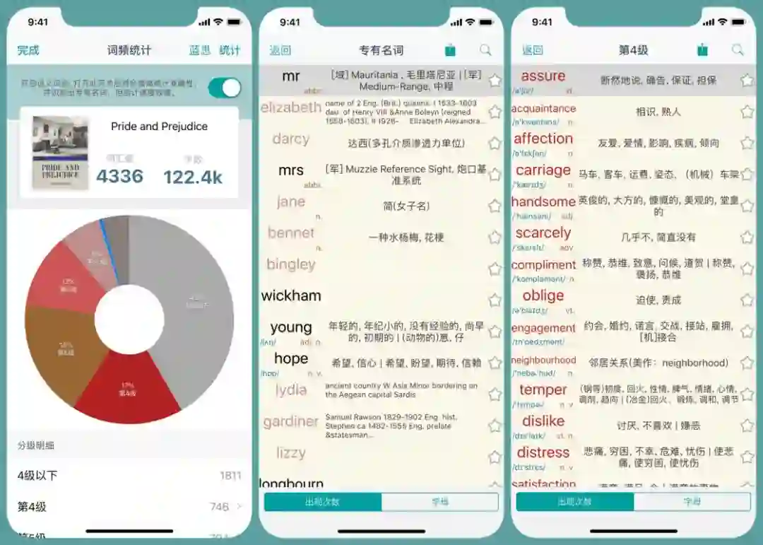 如果你没有时间细读全篇,蒙哥阅读器还能一键分析书内词汇,并生成四六级、考研、托福、雅思、专有名词等类别。你可以按照出现频率或首字母排序检索,十分方便。