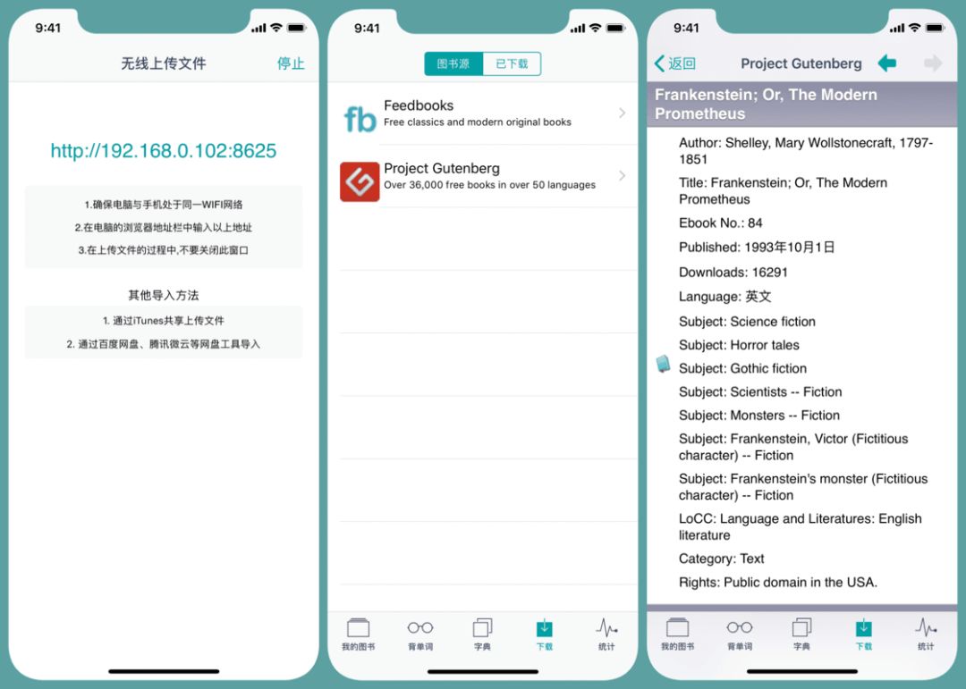 蒙哥阅读器的另一大特色,则是内置了 Feedbooks 和 Project Gutenberg 两家图书源,从莎翁经典到当代奇幻,都能在 App 内直接下载阅读。