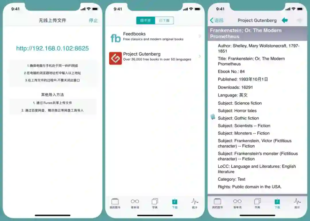 安装了阅读器,剩下的问题就是上哪儿找书了。蒙哥阅读器支持 iTunes、WiFi 和分享菜单 3 种本地导入方式,及 ePub、Mobi、PDF、DOC、TXT 等常见格式,足以满足大部分人的需求。