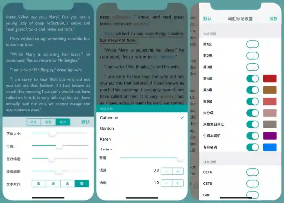 当然,蒙哥阅读器也没有忘记作为「阅读器」的本分,可高度自定义的阅读界面及全文朗读都令人满意,疑难词汇高亮标汇更是锦上添花。