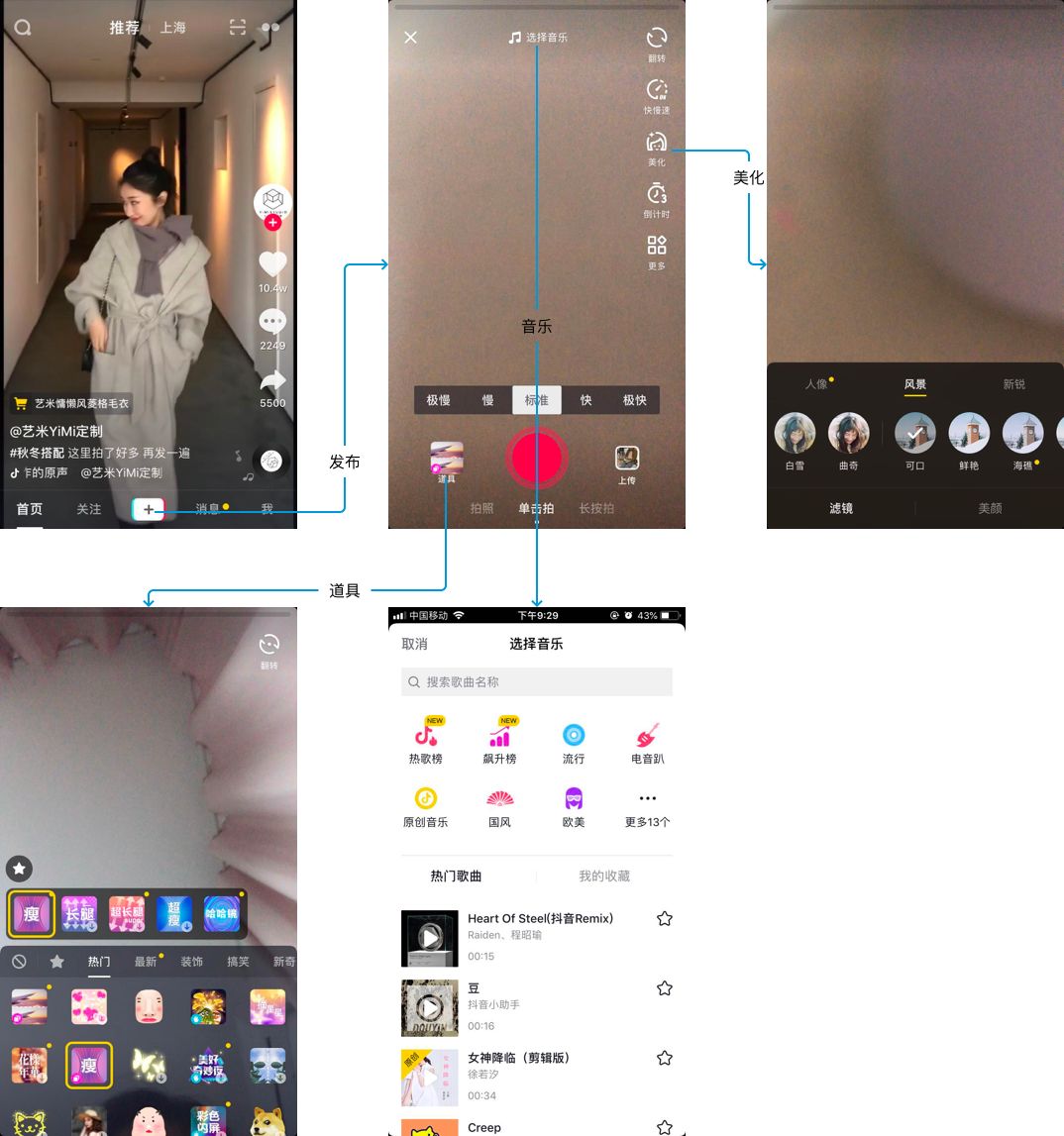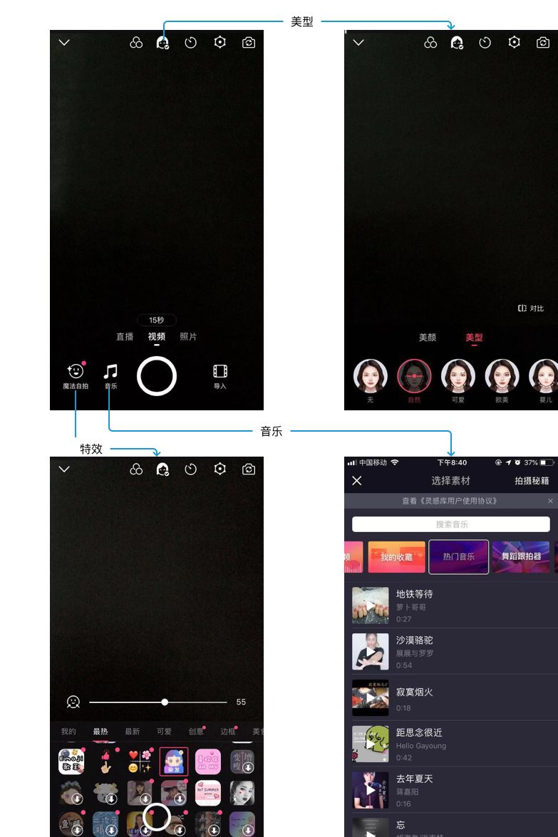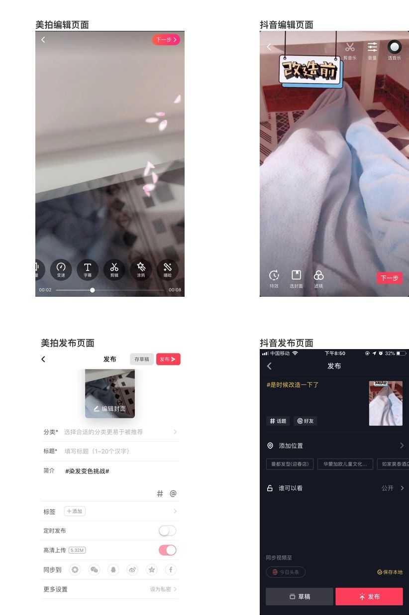 1.在内容生产方面,抖音提供了丰富的音乐曲库及简单的拍摄工具,让用户极易产出简短的视频。美拍提供了丰富的工具,及较长的视频时长,可产出具有故事性的丰富内容,但相对应的门槛也会提高。