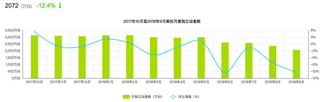1)美拍的月独立设备数为2072万台左右,且呈现一定下降趋势。与抖音的27966台相比差距非常明显。