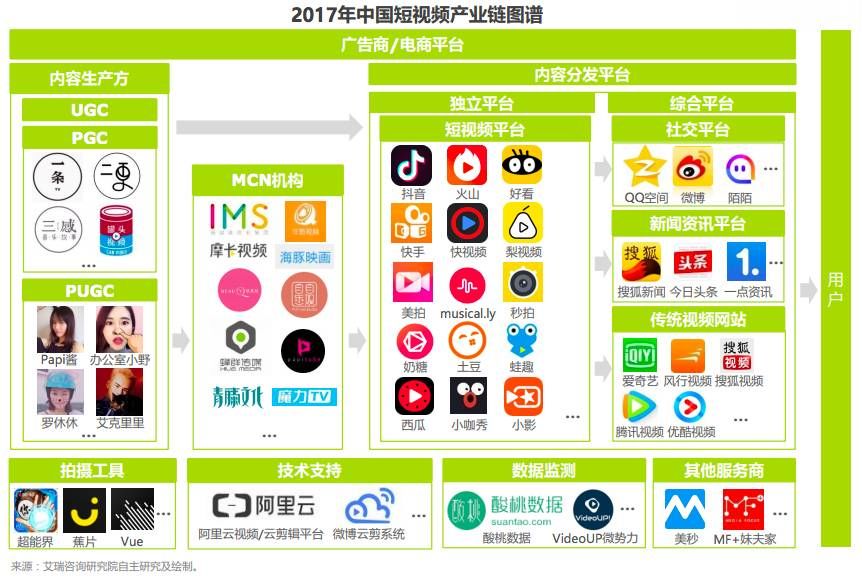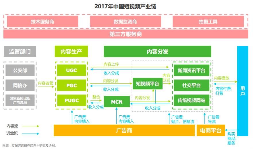 短视频行业产业链由内容生产方(UGC、PGC)到内容平台分发,整个链条较短。抖音和美拍都属于内容分发平台,非常依赖于上游的内容生产方及MCN机构。