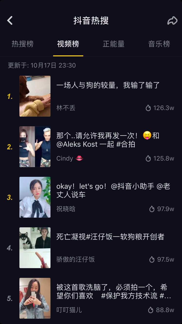从实时热门视频榜来看,视频的热度都是百万级的,其中第一名的点赞量就达到257.3万,可见用户点赞习惯是非常好的。