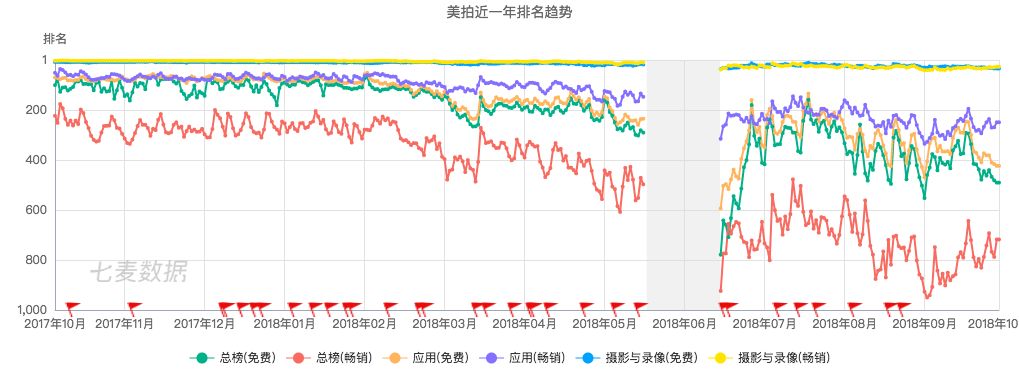 美拍的应用市场排名保持在五百名以内,虽与抖音有差距,但依然是非常好的排名。只是近几个月有所下降,在市场份额方面威胁明显。