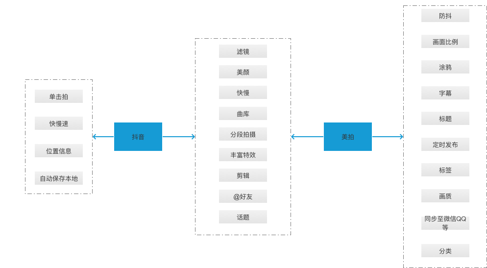 将以上分析总结如下图所示。美拍功能要复杂很多,也是源于其早期工具型的定位,以及美拍可以拍摄最长5分钟的视频。