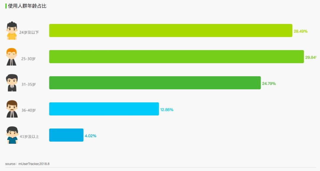 3)用户年龄分布中,24~30岁的用户最多,占比达58%,其次是31~35岁用户。用户群体很年轻,移动手机使用较为熟练和频繁。