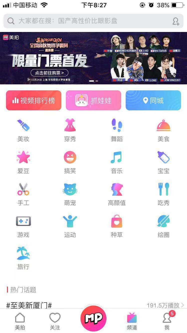 如下图所示,美拍专属的【频道】页面也是抖音没有的,在这个页面,排在前列的分类都是美妆、穿秀,也符合了美拍的女性用户需求,界面设计也非常少女心。