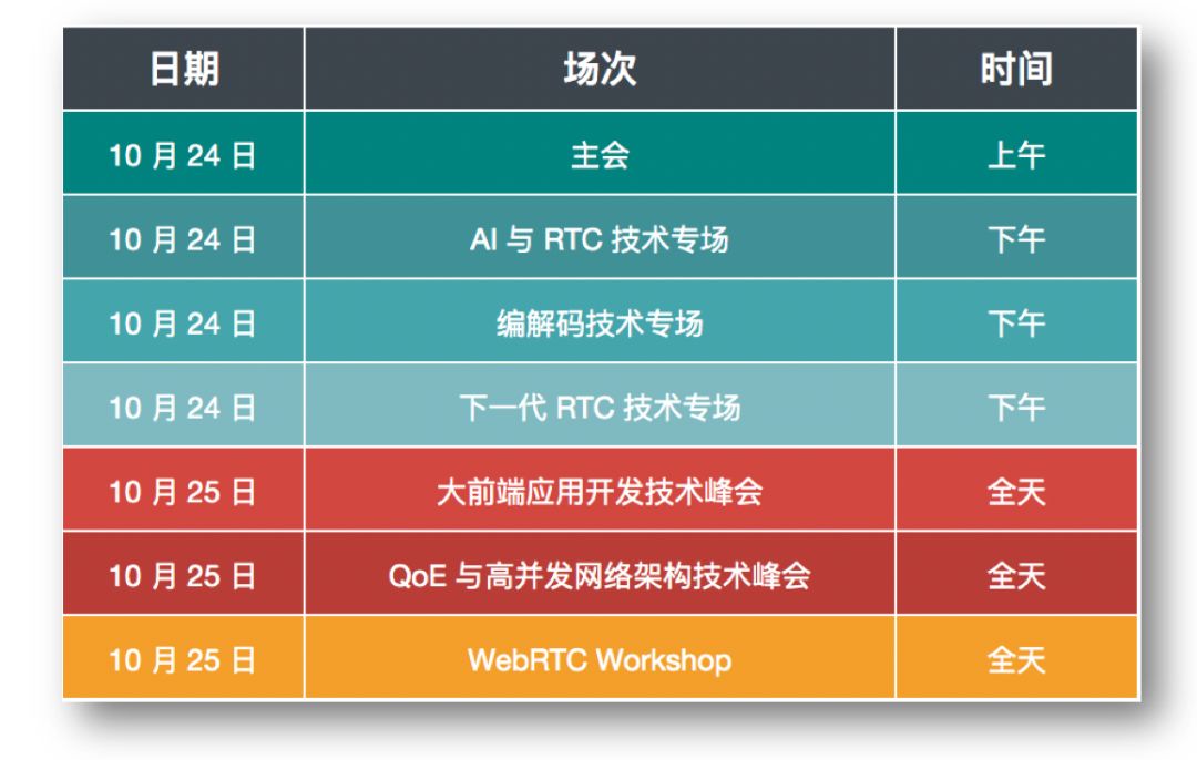 除了 AI 相关演讲以外,本届大会还设立多个技术专场以及 WebRTC 工作坊,大会日程如下: