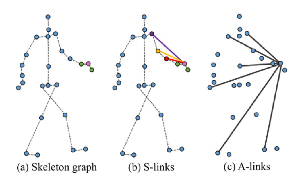 提出了AS-GCN,主要涉及了两种网络结构:Action-link和Structural-link。通过Action-link来发掘潜在的关节之间的联系,通过structual-link来发掘骨骼图的高阶关系。