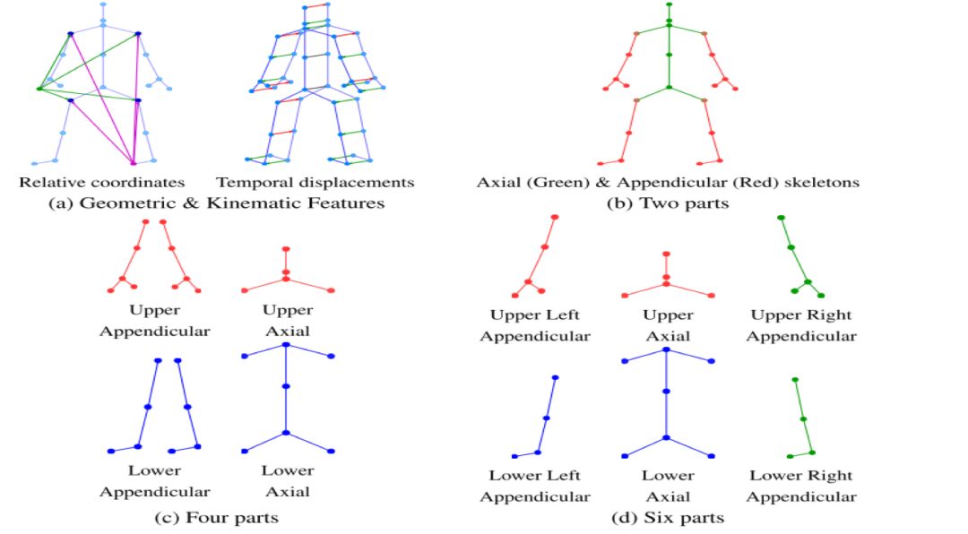 1.用几何特征(Geometric Features)和运动特征(Kinematic Features)来代替原始的空间三维坐标,作为每个节点的原始特征。如上图中的图(a)。
