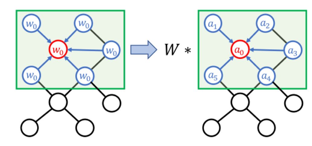 2. 权重是共享的,不会具体到每个节点,这和传统CNN相同。(直观的理解,如果权重是因节点而不同的,那么一旦图结构发生变化,权重就会立刻失效)