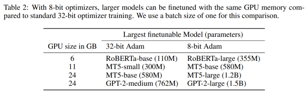可以看到,8位优化器在多个任务上均达到甚至是超过了32位优化器的性能,与此同时,还能大幅减小内存开销并加速训练。此外,作者还列出了在同等显存大小的条件下,使用8位优化器和32位优化器可以支持训练的模型。可以说,非常贴心了ヾ(●゜ⅴ゜)ノ