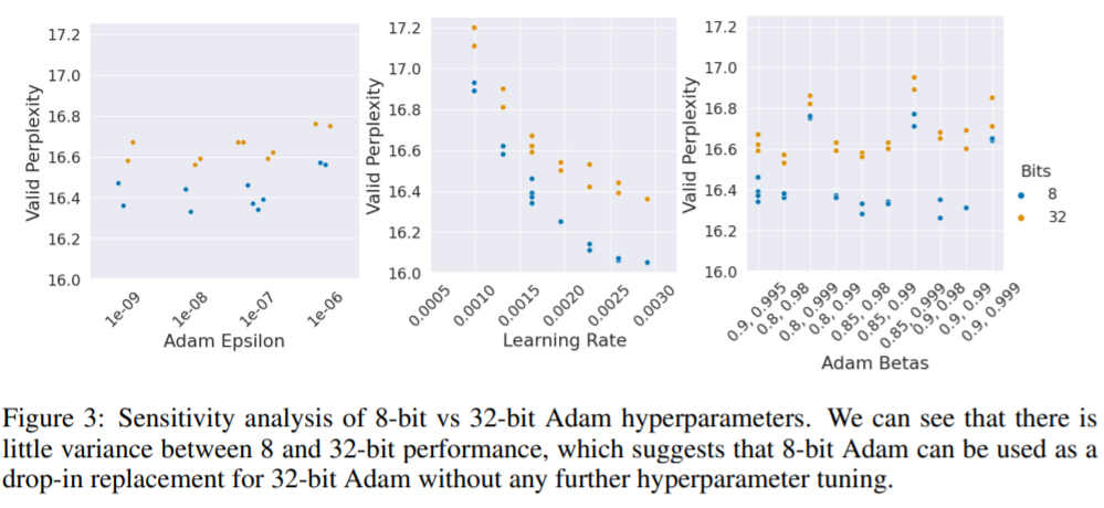 可以看到,8位优化器和32位相比,困惑度走势基本一致,表明对超参不敏感,在将32位优化器替换为8位优化器后,超参不需要进一步的调整
