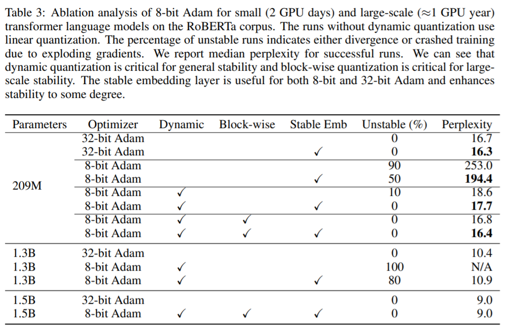 语料库训练了多个模型,用于研究8位优化器中各个组件的影响。实验结果如下:其中,32位优化器(baseline)采用的是线性量化。
