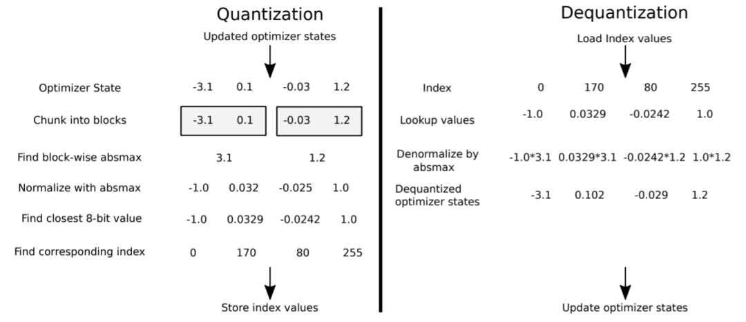 应用上述组件,将8位优化器的状态反量化为32位并更新状态和参数,然后将这些状态量化回8位进行存储。由于是在寄存器中进行8位和32位的转换,一定程度上可以减小内存占用并加速训练。
