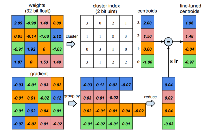 上图是 Song Han 在 ICLR'2016 上提出的量化方法。将模型参数分别聚类到几个质心,并将参数量化到对应的质心,在更新参数时,是将同一质心对应的梯度累加用于更新该质心对应的参数