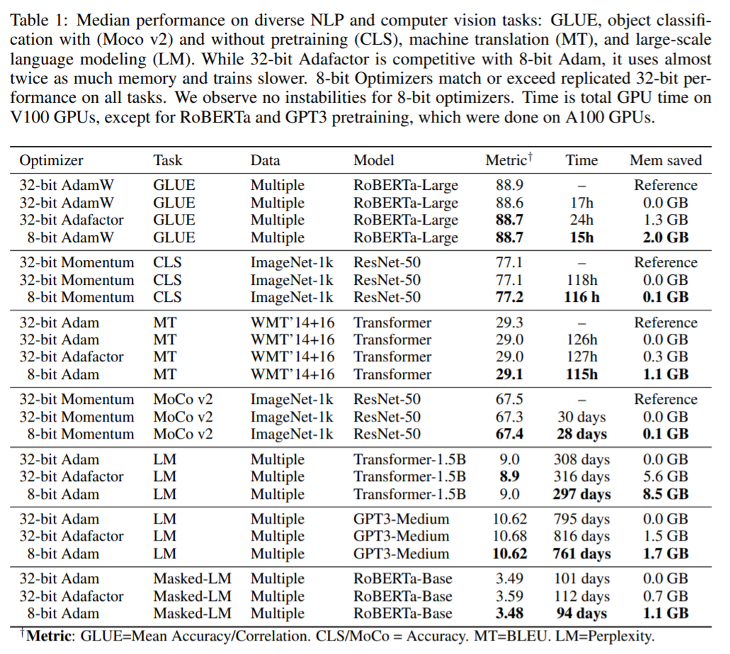 作者在多个任务(包括机器翻译、大规模语言模型的预训练以及微调、图像分类和图像预训练以及微调)上比较了8位优化器和32位优化器的性能,比较的优化器包括 、 或 ,实验中,除了将32位优化器替换为8位优化器外,没有改动超参和权重、梯度以及激活值的精度。