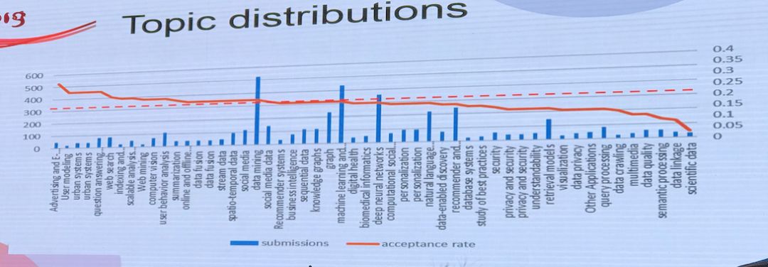 最有意思的是对论文话题分布的分析。话题论文的接收率(红线)一定程度上反映了审稿人的兴趣,若按接收率进行排序,可以看出广告和金融方向的论文更容易被接收;而对科学数据进行处理的文章更可能被拒绝掉。而另一方面,柱状图的高低则能够反映研究者的兴趣点,显然data mining、机器学习和深度神经网络仍然占据高位,而数据库、网页挖掘等则相对小众。