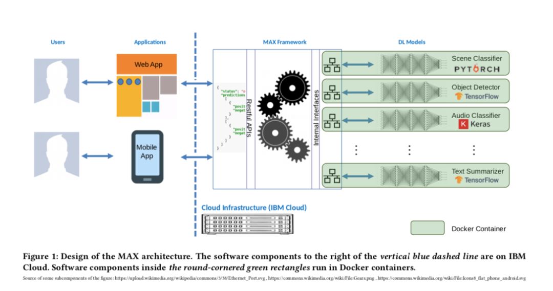 在这个系统中,底层的深度学习框架可以是任何一种,在此之上他们提供了一个开源的Python库(MAX框架),这个库会将深度学习进行封装,并使用标准化的RESTful API将编程接口进行统一化。开发者只需使用这些API接口,便可以利用封装在里面的深度学习模型,而不用去管底层的框架。
