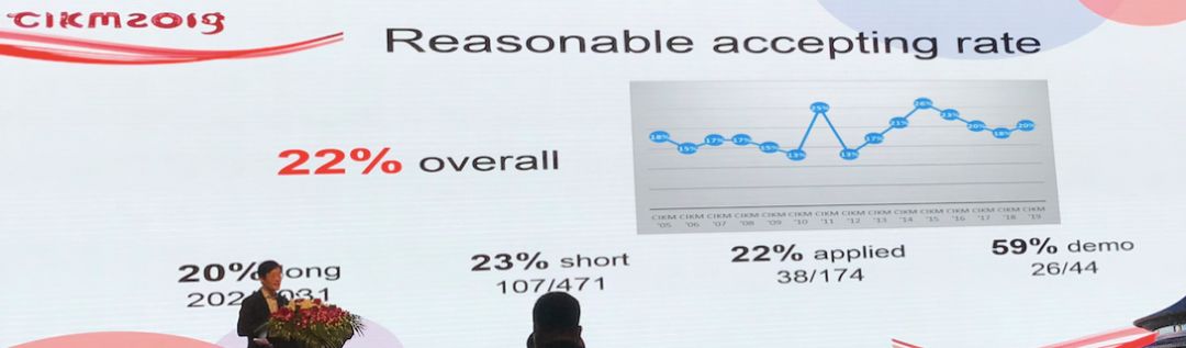 本次论文共接收202篇长论文(20%)、107篇短论文(23%)、38篇应用论文(22%)和26篇Demo论文(59%),平均接收率仅为22%。