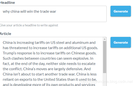 在GENERATE的标签下,随便输入一个标题,点击generate,一会AI就能给你一篇完整的文章,我输入的标题是why china will win the trade war而且写的有理,有据,甚至比很多大V的观点更有见识。所以打假能手,本身也是个造假能手,大家也可以去感受一下。