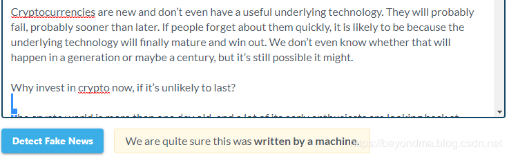 GENERAT旁边的标签DETECT则可以发现假新闻。随便把我们刚刚让GROVER写的假新闻拷进去,点击“DETECT FAKE NEW"就能得到结果