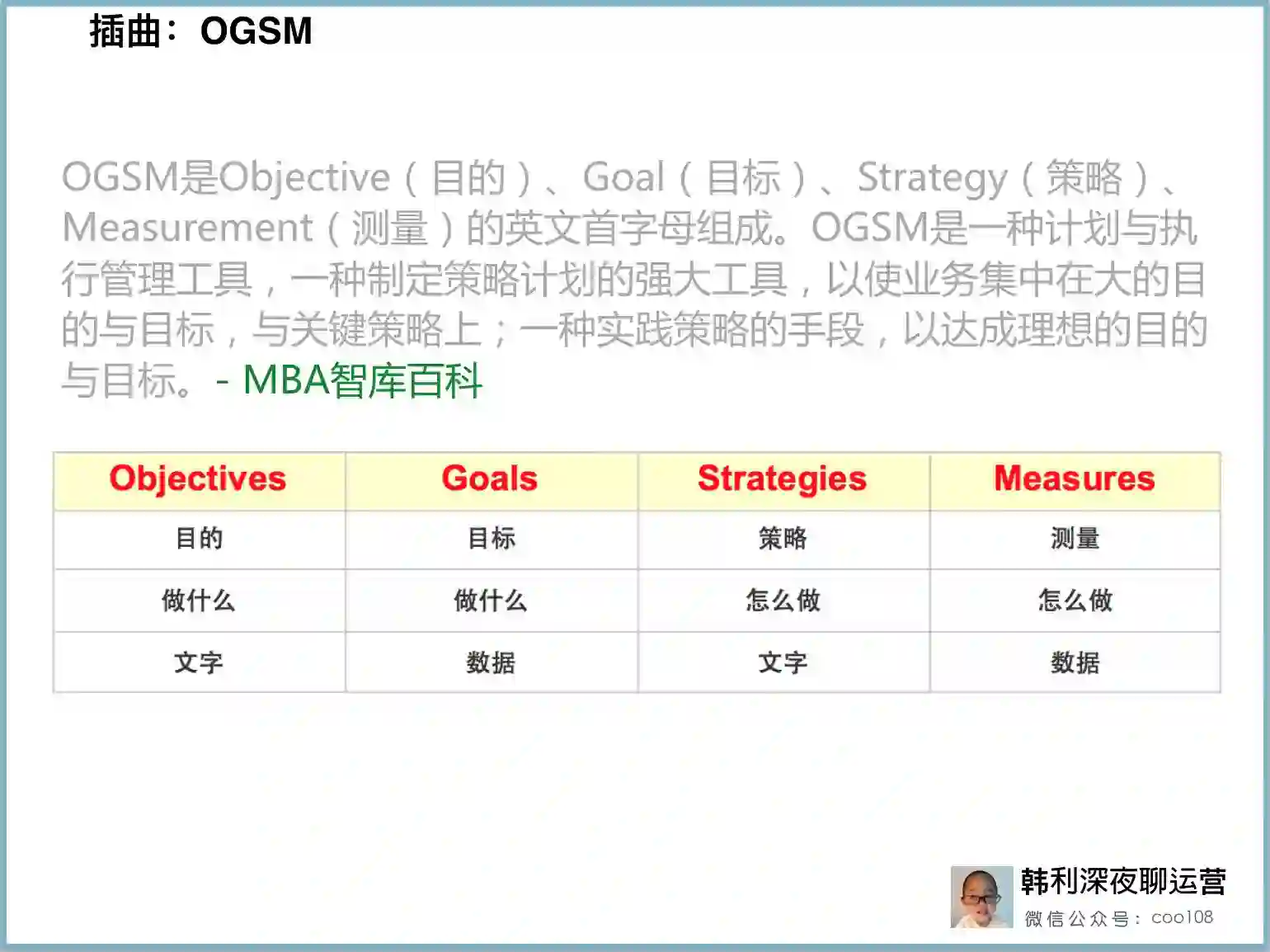 我们先讲一个MBA里的工具:如何拆解,给大家提供一个工具,叫OGSM。