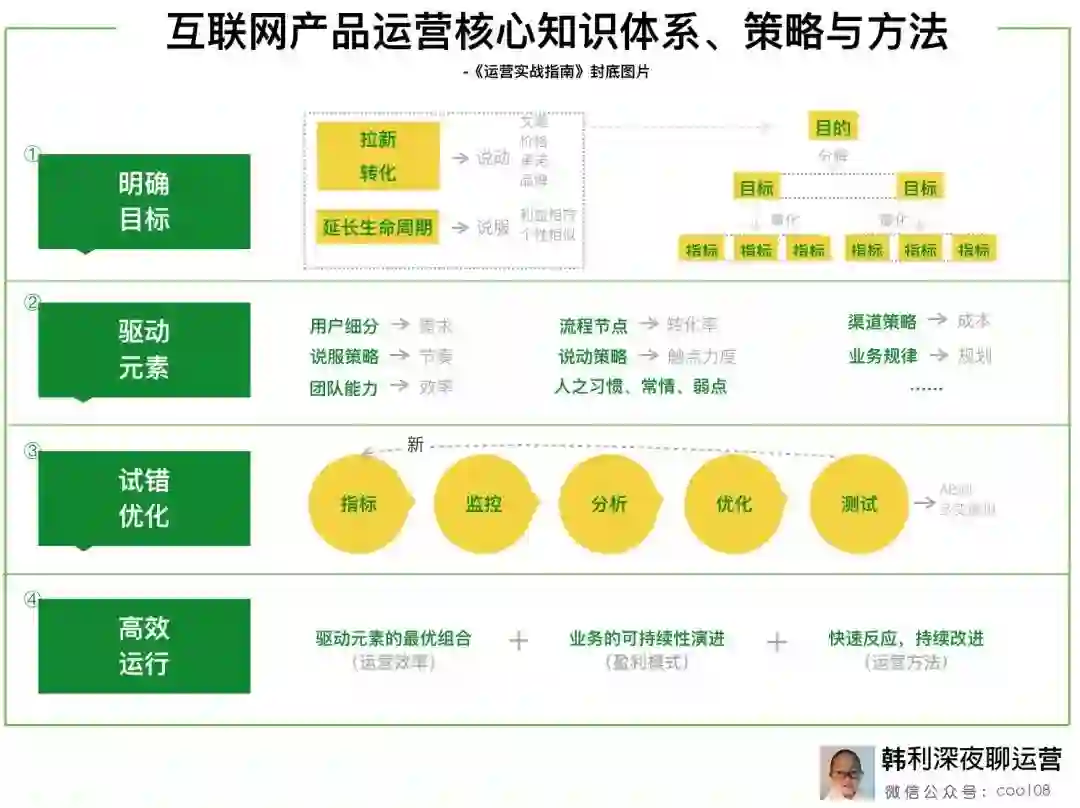 「起点」就是这幅图的第一步,明确目标,「终点」就是这幅图的第四步,高效运行(什么是运行,大家可以看这篇文章《姑娘,你其实只是个运行经理》)。「关键词是调优变量」,这就是这幅图的第二步第三步,寻找关键驱动元素和试错优化。