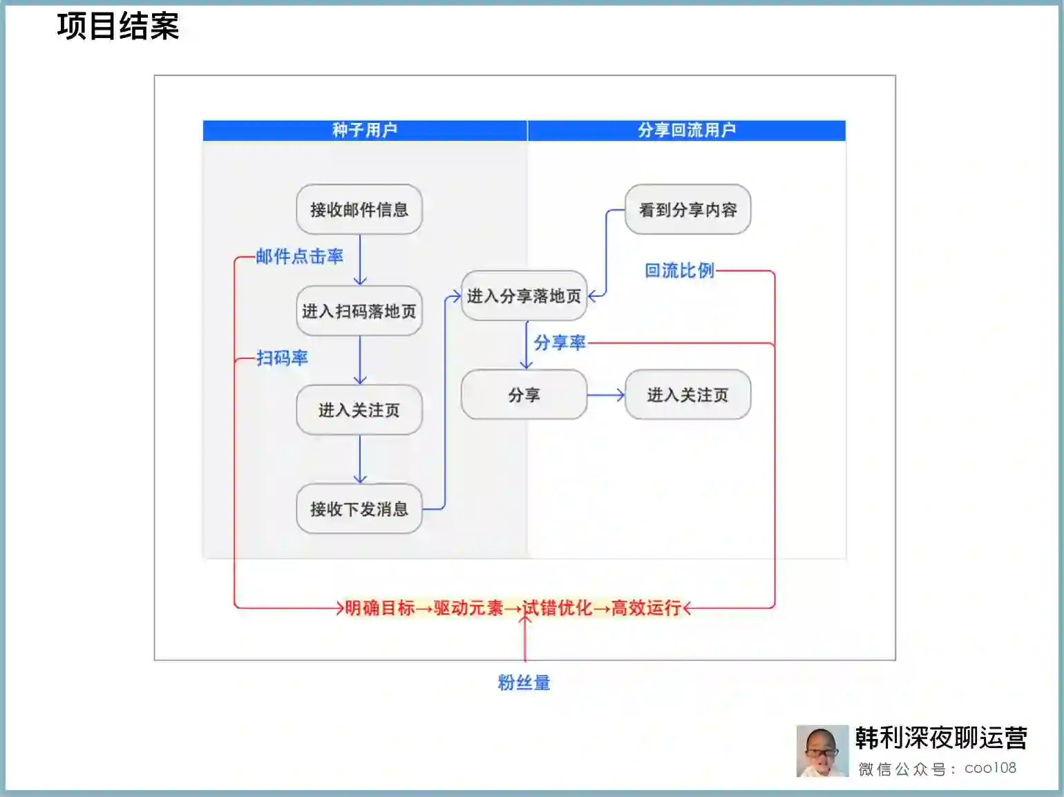 这里有两类用户,我图里画的很清晰了——种子用户和回流用户。通过邮件这个渠道引进种子用户,靠红包刺激种子用户传播来拉新。