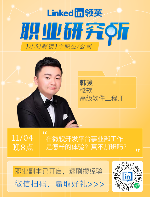 登入微信小程序“领英学生版”,进入“职业研究所”直播间,微软开发平台事业部的研发工程师——韩骏老师,将与我们一起聊聊在微软工作的那些事儿。