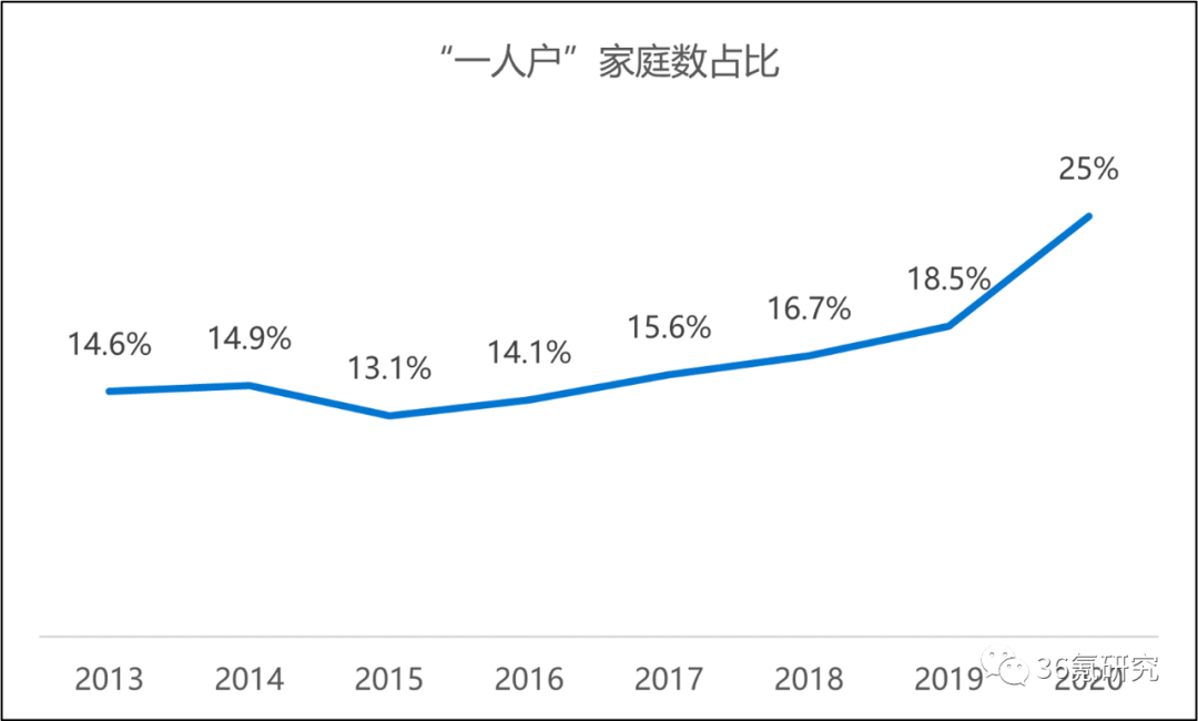 生活方式的改变和单身人数的增加共同驱动预制菜需求的提升。近年来,随着生活节奏的加快、健康意识的增强和可支配收入的提高等,人们对食品健康、质量要求愈加提升。外卖用料品质难控、居家烹饪过程繁琐等难以满足人们在快节奏生活下对于食品的要求。而预制菜的免切、免洗、免配的特点,为消费者节省烹饪前期准备时间的同时,也为消费者提供高品质的菜品和口感,有效满足当下消费者对于饮食便利、健康的需求。另外,预制菜可满足单身人群对饮食快速、方便、小份等“一人食”的需求,而“一人户”数量的增多也为预制菜市场的进一步扩大提供需求支撑。根据中国统计局数据,2020年“一人户”家庭数超过1.25亿,占比超25%。根据贝壳《新独居时代报告》,到2030年中国独居率或将超过30%。