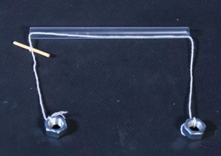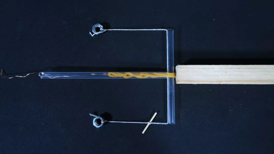 从装置图可以看到,绳子穿过吸管连接着螺母,形成了一个无固定悬挂点的摆。当我们释放水平吸管时,吸管受到橡皮筋对它作用力开始转动,螺母由于受绳子的牵引也会跟着转动,但是,当绳子在运动过程中触碰到立柱时,会发生缠绕,此时橡皮筋被“擒”,停止作用。缠绕结束以后,由于重力的作用,螺母开始下落,释放重力势能,带动绳子解开缠绕。缠绕解开后,螺母就不再提供动力,这时橡皮筋被“纵”,又开始对吸管产生作用力,这样就回到了最开始的情形。一擒一纵,一收一放,如此往复,就形成了一个有较长周期的周期运动。