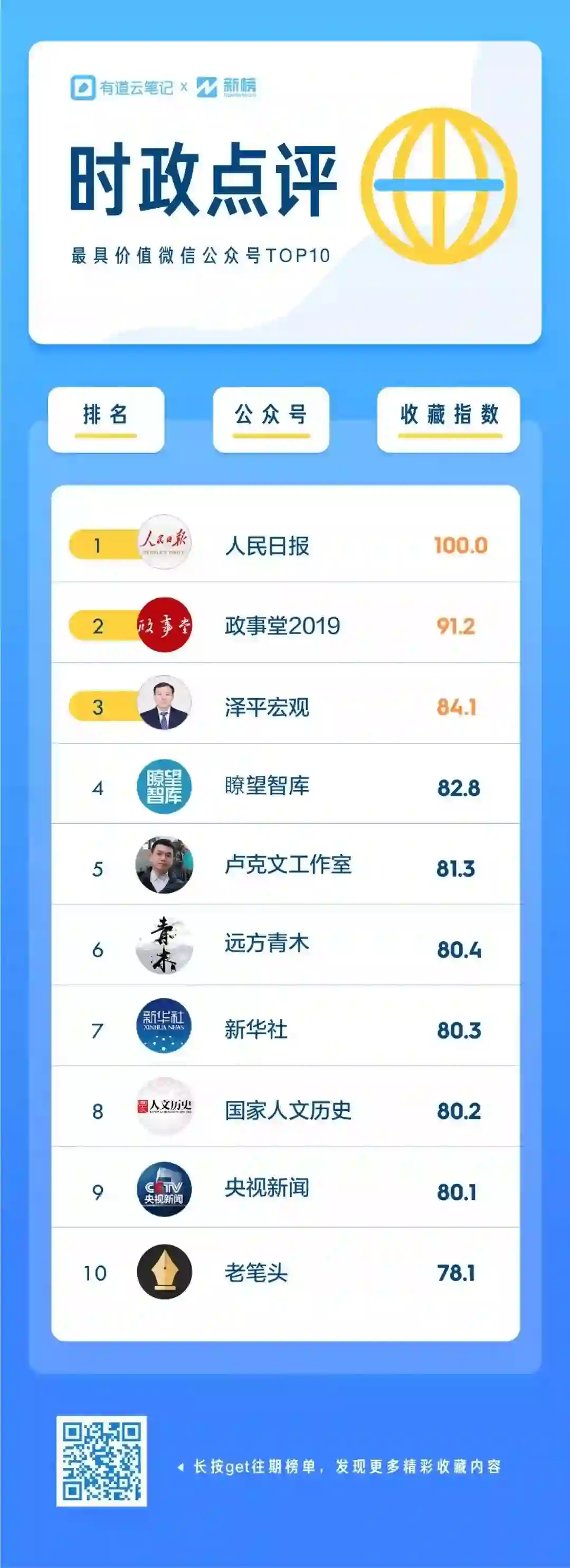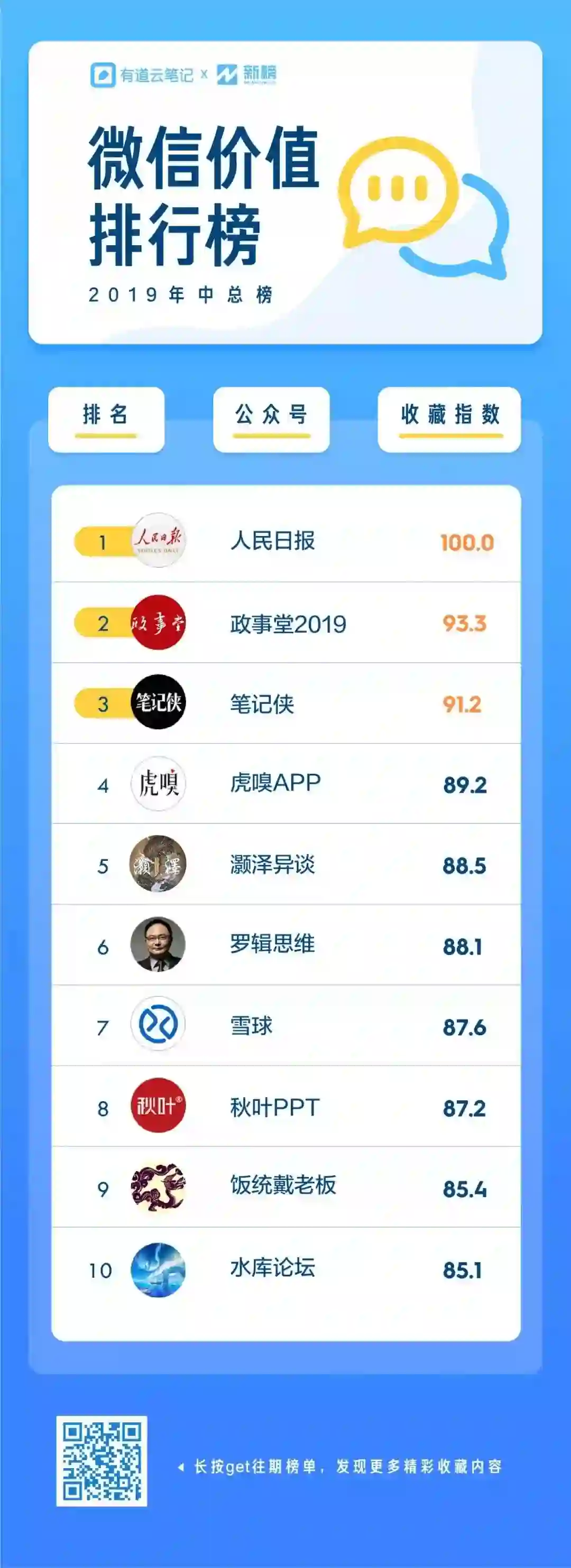 对比第一季度,「人民日报」超过「政事堂2019」重回榜首,新上榜的「灏泽异谈」凭借对人性/生活精准洞察,攀升到了前五,「水库论坛」因为独特的投资内容,再度重回榜单。