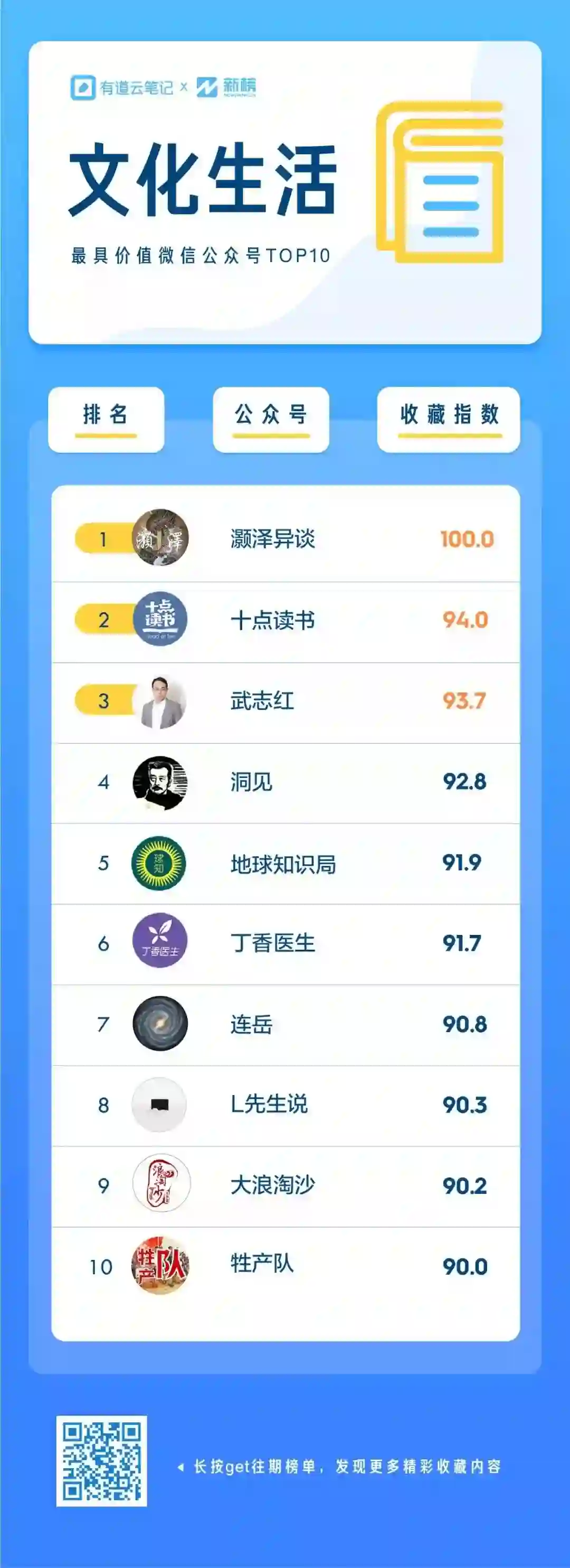 文化生活榜单中,「灏泽异谈」冲至榜首,新上榜的「L先生说」专注心理学思考,本期上榜的「大浪淘沙」和「牲产队」也是上一届新锐榜中的账号。