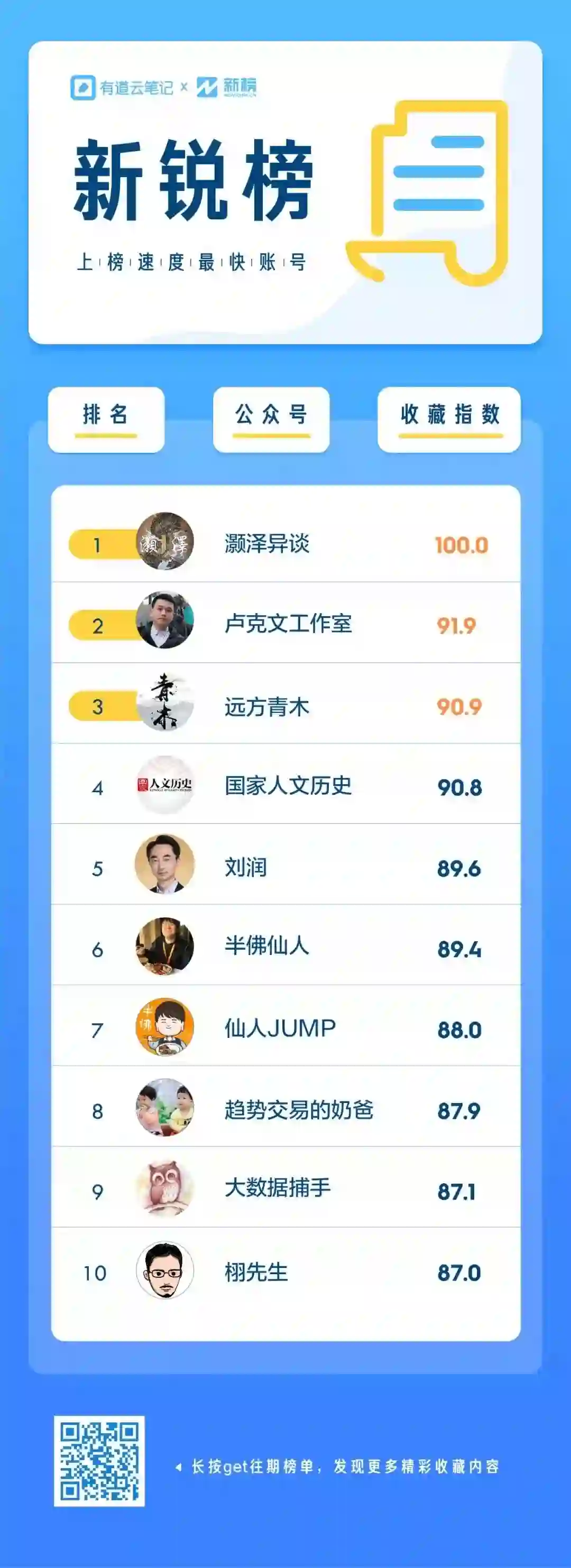 避免马太效应,“新锐榜”反应的是收藏量攀升最快的账号,「卢克文工作室」凭借对时事热点深度解读,受到不少用户欢迎,同类型的「半佛仙人」、「仙人JUMP」、「大数据捕手」内容解读各异,以飨读者。效率提升类的「刘润」、「栩先生」和股市分析类「趋势交易的奶爸」同样引人关注。