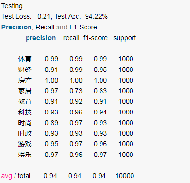 在测试集上的准确率达到了94.22%,且各类的precision, recall和f1-score,除了家居这一类别,都超过了0.9。
