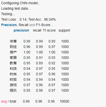 在测试集上的准确率达到了96.04%,且各类的precision, recall和f1-score都超过了0.9。