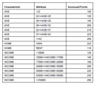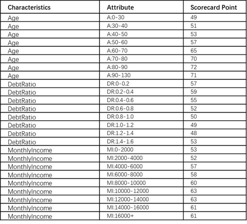 本文会介绍最受欢迎的信用评分方法,我们称为评分卡模型。有两个原因使其成为主流的方法。首先,评分卡模型很容易跟没有相关背景和经验的人(诸如客户)解释说明。其次,评分卡模型的开发过程很标准且被广泛接受,这意味着公司不需要投入太多研发经费。以下是评分卡的样例,后面会讲到如何使用。