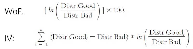 所有特征分组后,特征工程就完成了。接下来是计算每个属性的证据权重(WoE)以及每个特点(特征)的信息价值。之前提到将所有数值类型都分桶处理后转换为分类型特征。然而不能直接用这些分类模型去拟合模型,所以需要给这些分类特征赋予一些数值。计算证据权重(WoE)的目的是为每个分类变量分配一个唯一值。信息价值(IV)用来衡量特征的预测力,将被用于特征选择。下面给出WoE和IV的公式。这里“Good”意思是客户不会有严重逾期或者目标变量=0,而“Bad”客户会产生逾期目标变量=1.