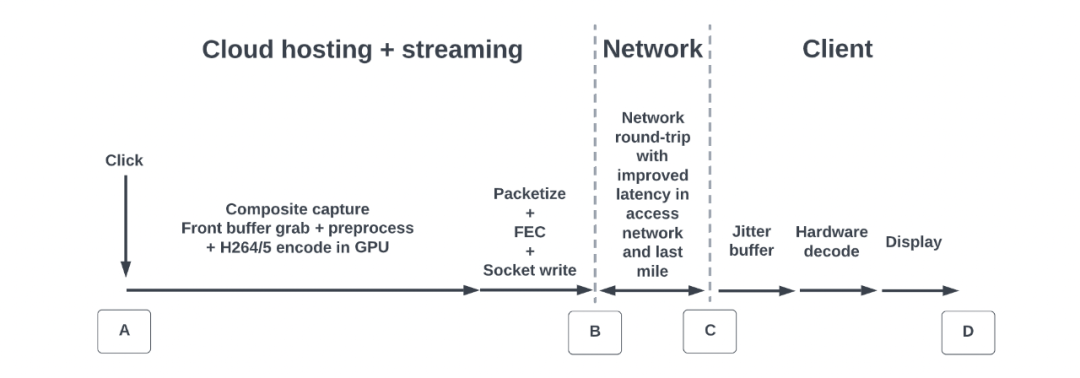 无论玩家在何时点击执行游戏中的动作(例如让游戏角色跳跃),我们都会捕捉到点击事件并将其发送给服务器,服务器将接收到这个事件。然后,游戏渲染包含该动作结果的帧(即角色跳跃)。我们捕获并复制渲染的帧,使用视频编码器对其进行编码,然后将其打包,装入用户数据报协议(UDP)数据包,再通过网络发送给玩家。最后,玩家端有一个抖动缓冲区来平滑接收到的数据包。我们将数据包解码为帧,然后为玩家渲染帧。